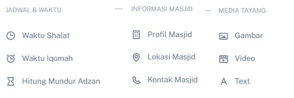 Menampilkan jadwal shalat, countdown iqamah, kutipan islami, pengumuman masjid, dan lainnya.